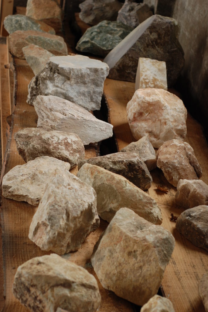 Stenen die in het atelier aanwezig zijn: Speksteen, Albast en Serpentijn Opaal en Serpentijn Raindrop.